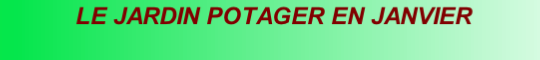 Travaux généraux : - Pour beaucoup de jardiniers, janvier semble être le mois du repos. C’est l’époque des grands froids, c’est entendu ; il faut s’y attendre. Cependant chaque année nous apporte un hiver d’aspect particulier. Nous pouvons avoir des périodes pluvieuses et douces, dont un jardinier avisé sait tirer parti en activant bêchages et défoncements. Le but à atteindre est d’être prêt aux premiers jours de printemps et même dès la fin de février. Continuez donc ces travaux, qu’une gelée de – 5° ne vous arrête pas. Pour parer au durcissement, vous aurez couvert le terrain d’une couche de fumier, de feuilles, que vous enfouissez en bêchant à bonne profondeur de bêche, ce qui est parfait pour tous les légumes. S’il fait vraiment trop froid, amenez cependant à pied d’œuvre fumier et terreaux dont vous aurez besoin au dégel.